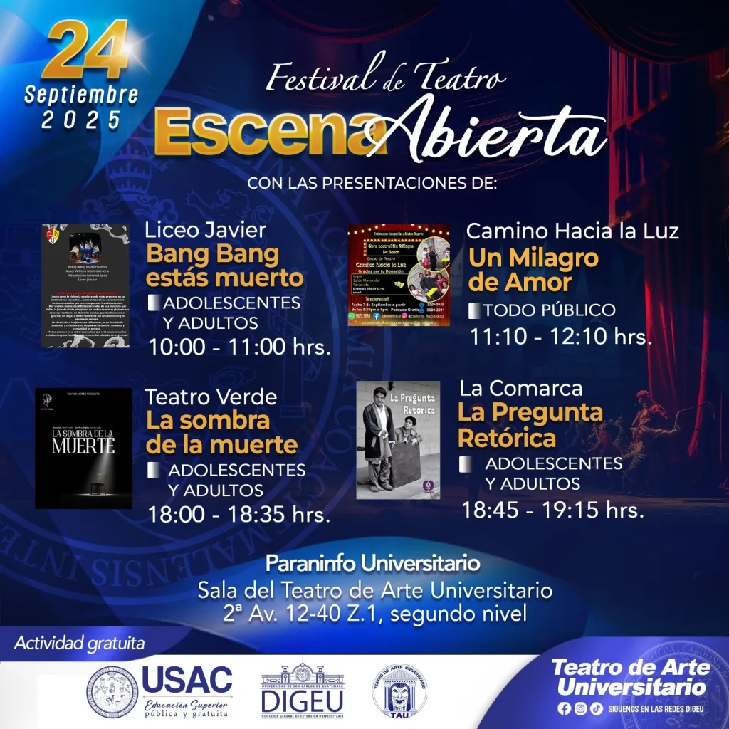 El telón del Festival de Teatro “Escena Abierta” vuelve a levantarse este miércoles 24 de septiembre con una variada y atractiva selección de obras teatrales. La iniciativa, impulsada por la Universidad de San Carlos de Guatemala, continúa ofreciendo un espacio de alta calidad para las artes escénicas con acceso completamente libre para el público.
