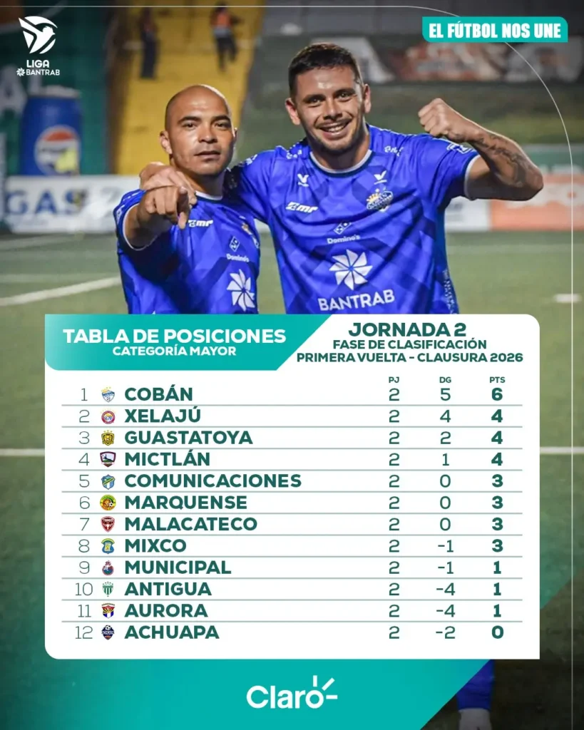 Concluyó la segunda fecha del Torneo Clausura 2026 de la Liga Bantrab, y el panorama del fútbol guatemalteco comienza a definirse con una sorpresa en la cima. Cobán Imperial se posiciona como el único equipo capaz de mantener el paso perfecto, sumando seis puntos de seis posibles. Su contundencia ofensiva es notable, acumulando ocho goles a favor, lo que les permite dormir como líderes absolutos.