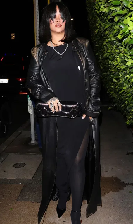 Bajo la gabardina, que decidió llevar abierta y sin cinturón, Rihanna lució un ajustado vestido negro de punto con un detalle asimétrico y una abertura alta en la cadera, complementado con medias semitransparentes. La elección de accesorios mantuvo el aire de exclusividad: un collar de diamantes y un bolso Gucci Horsebit en formato east-west. Es notable cómo la artista adaptó la propuesta de pasarela —donde el diseño se combinaba con zapatillas voluminosas— al elegir zapatos de ante con punta, inyectando al look una identidad propia y urbana.