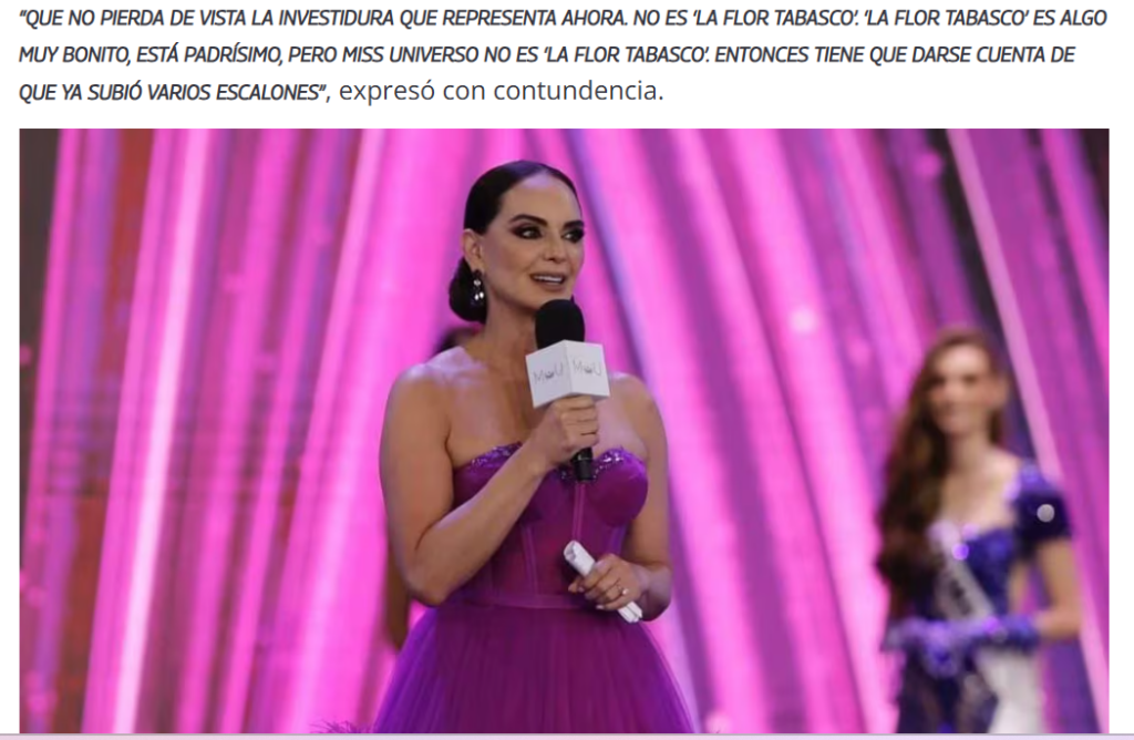 Jones fue contundente al señalar que el comportamiento de la joven tabasqueña no corresponde a la “investidura” de una Miss Universo. Según la empresaria, Bosch debe entender que ya no se encuentra en un certamen regional. “Miss Universo no es La Flor Tabasco”, declaró Jones, haciendo referencia al concurso local que Fátima ganó previamente. Para Lupita, una reina internacional debe mantener un protocolo y una imagen que proyecte elegancia y estatus, sugiriendo que la espontaneidad mostrada en el carro alegórico fue “fuera de lugar”.